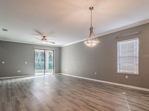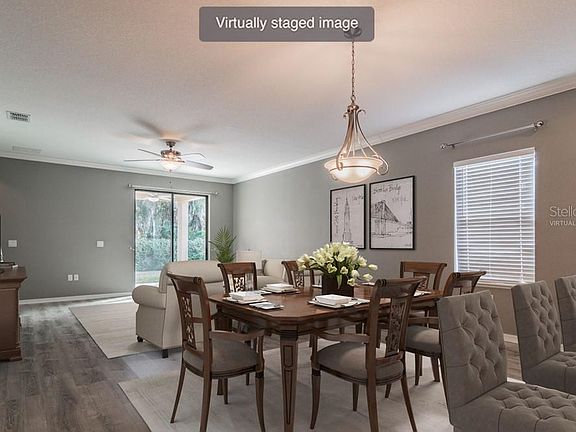 One or more photo(s) has been virtually staged. Wonderful 3 bedroom +office/den, 2 bathroom, 2 car garage single story home in Palmetto. Upon arriving at this home, you are welcomed into a foyer that leads to the office on the right and then on forward to a spacious family room/dinning room/ Kitchen combo, high ceilings, and a large sliding door that leads to the porch. The kitchen is equipped with a large pantry, ample cabinet and counter space, plus a large Island with breakfast bar. Overlooking the kitchen is the family room with high ceilings, laminate floors, and fan. This home has a split bedroom floorplan that you will love. The primary bedroom features carpet, high ceilings, large walk-in closet, and an en suite bathroom with double sinks, soaking tub, separate water closet and a walk-in shower. Outside, you can relax on your covered patio with views of the large fully fenced back yard. Located in Palmetto, this home is convenient to shops, restaurants, and I-75 for an easy commute to Tampa, Beaches and surrounding areas.
