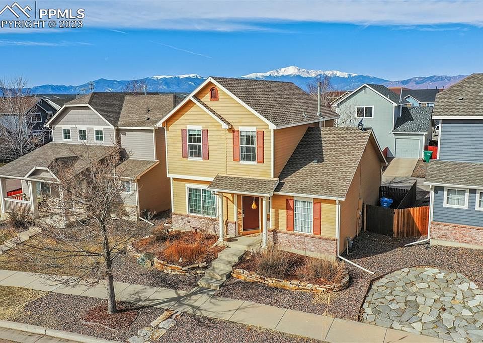 Charming and very well appointed single family home with views of Pikes Peak and directly across the street from Snowy River Park! This 3 bedroom, 3 bath, oversized 1 car garage home has been lovingly cared for and well maintained. The main level which offers an open family room and spacious eat-in kitchen has been updated with luxury vinyl plank. The charming kitchen features granite counters, updated cabinetry, and stainless appliances. Walk-out onto a large deck to take in the mountain views or to enjoy dining al fresco! Fully fenced backyard with a lush green lawn during the summer months. Also included on the main level are the laundry room, an updated half bath, and ample storage closet. Upstairs you will find 3 bright and airy bedrooms including the master suite which features an updated private bath with spacious shower. Two additional upstairs bedrooms share the updated hall bathroom. Furnace replaced in 2022. Water heater replaced in 2020. Newer roof and windows. Wonderfully located with access to all the amenities the Powers Corridor has to offer to include entertainment, shopping, dining and so much more.