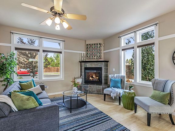 You will fall in love with this spacious, light and bright move-in ready two-story home. The open concept main level features beautiful Bamboo wood floors, wood beam accents, cozy corner fireplace, ample kitchen cabinet storage, breakfast bar and a built-in writing desk. Main living space opens up to a charming patio in the private, fully fenced back yard, perfect for unwinding and entertaining. Head upstairs to your dream master bedroom with Juliet balcony and indulge in the amenities of your en-suite bath with open walk-in closet, soaking tub, glass block walk-in shower and double vanity. Two generous sized guest rooms with a shared bathroom complete the second level. Large side lawn area for your pups to run. Two car attached garage. Great location and walking distance to the future 37-acre Alpenglow Park. This property will go quick!