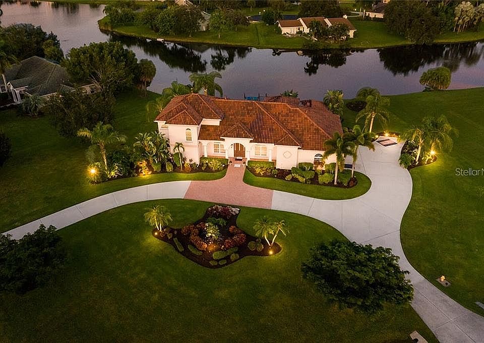 Stately, but without the price tag. This home has every premium feature that buyers in this market want. A sizable lot, volume ceilings, hard surface flooring, a view, and even 2 master suites. The home has 2 offices as well, one even connected to the upstairs master for private work-from-home options. The kitchen has high-end appliances, the ACs have been replaced recently, surround system in the media room, and a whole-home generator is outside just in case. The Mediterranean flair of the home is seen from all corners. A beautiful terracotta roof, circular driveway leading to a 3-car garage, lush landscaping with LED uplighting, and an expansive pool deck out back. The neighborhood is gated, has no CDD fees, is smack in the middle of top-notch schools, and is close to I75 for easy commuting. A ton of upgrades, jammed into one spectacular home, in a fantastic location.