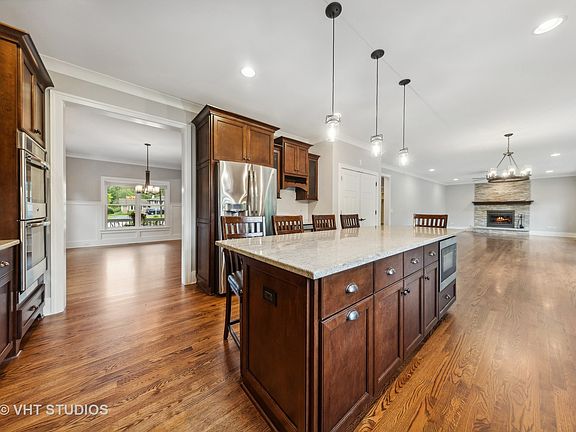 Welcome to 6113 Dunham Road. This exceptional custom-built residence in the desirable Hillcrest neighborhood offers 5 bedrooms, 4 full bathrooms, and an attention to detail that cater to the discerning buyer. Step into the inviting foyer that sets the tone of elegance and sophistication, with hardwood floors and over-sized base and crown molding extending throughout the home. The spacious formal dining room with multiple windows and handcrafted wainscoting provides the perfect space for hosting elegant dinners. The heart of the home is the expansive great room, featuring a dream kitchen, the open family room anchored by a stunning wood-burning stacked stone fireplace, and spacious eating area, all offering views of the generous, private yard. The sliding glass door leads to the backyard, seamlessly connecting indoor and outdoor spaces. Culinary enthusiasts will love the sprawling 10 FOOT ISLAND with seating for five, built in double oven, five burner cooktop with custom exhaust hood, granite counters, white tile backsplash and Grohe faucet. The bar area with a beverage refrigerator, an extra-large pantry closet and the custom-built cabinetry, make it a hub for entertaining family and friends. Main level related-living possible with bedroom and an adjacent full bath. The convenient mudroom with custom-built lockers, large walk-in storage closet and laundry facilities complete the first floor living space. Ascend to the second floor to discover the opulent primary suite, a true retreat, featuring a tray ceiling, two expansive walk-in closets, and a lavish ensuite bath. Indulge in the spa-like shower, extra deep bubble tub, double sink vanity, and private water closet. The second and third spacious bedrooms include walk-in closets. The fourth bedroom is equipped with access to the attic space, with endless possibilities for use. The shared hall bathroom features a double sink vanity and an extra-deep tub with shower. A cozy loft area invites you to curl up with a book or would be an ideal spot for completing homework. The fully finished basement adorned with new luxury vinyl flooring and fresh paint, make this the perfect space for entertaining or relaxing. The office is light and bright with a large window, closet, and full bath with walk-in shower, steps away. The enormous rec room is an ideal multi-use space - from movie nights to pool or ping pong. Finished room on far end of space previously used as wine cellar/storage. Additional storage abounds with 3 separate areas that also house the sump pumps, furnace, water heater and electric panels. The oversized lot includes a fenced area off the kitchen that opens onto the spacious patio, with 7-person hot tub, ideal for outdoor gatherings and relaxation. The 3-car garage provides ample storage and an additional Tuff Shed in the backyard for extra convenience. Freshly painted interior and beautifully buffed and polished floors enhance the home's allure. Move in just in time for the school year and enjoy the convenience of walking to the local elementary and high schools, with the bus to the middle school stopping right at your front door. Imagine your life in this extraordinary home. Don't miss this opportunity to make this exquisite property your own and experience the ultimate in Downers Grove living! Feature sheet in Additional Information above.