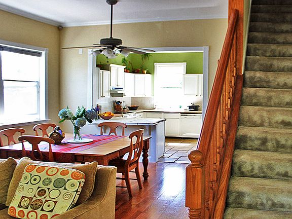 Perfect floor plan-Cute house! Great room has open floor plan w/lots of big new windows-living,dining and Kitchen with eating bar! Kitchen is big and bright with high ceilings, lots of cabinets, and door to fenced private back yard + deck. Sunny laundry/mud room is off the kitchen and has french doors. Huge bedroom on main floor plus bath. The staircase is really wide and open to living room- so adds spacious feel. Upstairs there are 2 large bedrooms, one is huge! And a full bathroom. ...