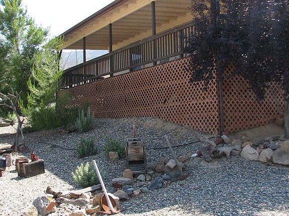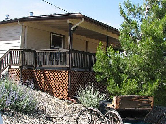 Custom upgraded mfg home with s step down den-Very unique. Looks like a stick built home. 9K Granite counter top upgrade, stainless appliances, vaulted ceilings, skylights, garden tub, central air/heat and wood burner. Dual pane windows upgraded 30 year roof and extra insulation. Walk in pantry, mini office w/built-ins at the end of the hallway. Split wing design.48 x 10 and 30 x 10 covered decks surround the front and east side of home with mountain views and lake views-when we have water. Entire driving/parking areas on the property are covered with gravel. Huge concrete patio in rear. 2 car 936 sq foot garage with 12 x 25 workshop/man cave. All appliances included. RV parking behind garage with RV Hook up and dump station connected to the septic system .