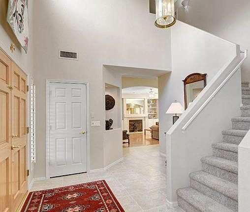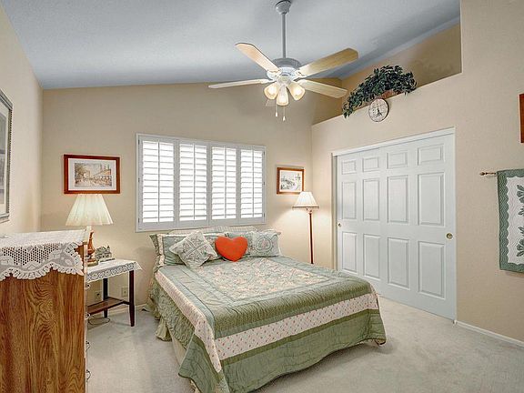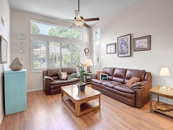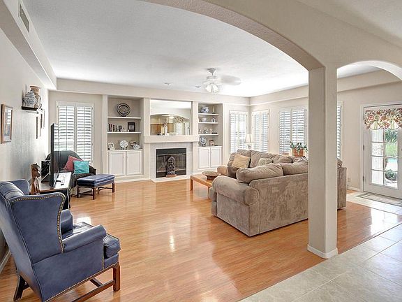 This light-filled plan boasts big entertaining spaces. Beautiful new wood-look floors, high ceilings, plantation shutters, dual pane windows, newer AC units and more. Spacious island kitchen with handsome Oak cabinetry, Corian counters, new tile and desk. Sunny bay breakfast nook. Formal dining room with chandelier. Fireplace and custom built-ins in the family room. Double-doors reveal the huge sitting room master with walk-in closet. Large laundry. Don't miss the total custom garden yard! Striking Maui island silk grass, pavered patios, Pergola with electricity, pool, newer Kool Deck and raised garden bed,move in ready.
