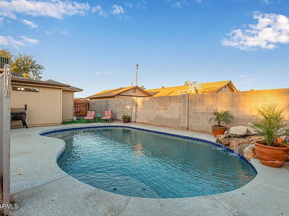 Situated in a desirable NO HOA neighborhood, the charming red brick home with interior updates is both cozy & modern. The property features 2 RV-GATES spacious side yards, garage workshop & additional covered storage room for all your toys & tool storage needs. The backyard offers a natural grassy area & SPARKLING POOL with new pebble finish. Step inside to discover modern upgrades throughout, including LVP flooring, fresh paint, modern fixtures, plush bedroom carpet, gorgeous fireplace w/custom wood mantle & much more! The 3-bed, 2-bath home includes two living areas, split master bedroom, walk-in closets, & spacious kitchen, great for entertaining. Perfectly located near Thunderbird Medical Center, ASU West Campus, & only a short drive to historic-district Downtown Glendale.