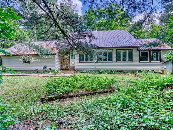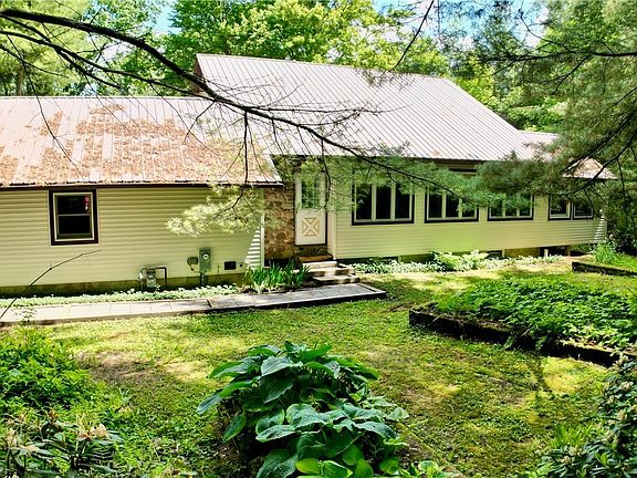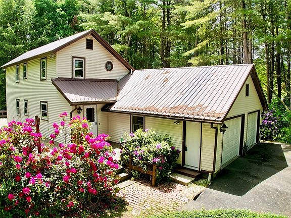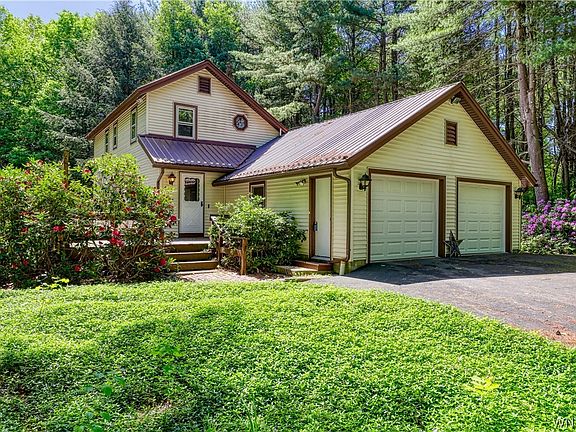 This home will feel like a park with its idyllic creekside and secluded setting. With 3 bedrooms, 3 baths, first-floor laundry, a two-story knotty pine-lined living room with a wall of windows, a sunroom, a spacious kitchen with loads of cabinets, an attached garage, and a second garage with a second-story hobby room. Located on a peaceful cul de sac, the exterior features a long wrap-around deck facing the creek, with extensive perennial ground cover for easy maintenance, and its all only minutes from Ellicottville!