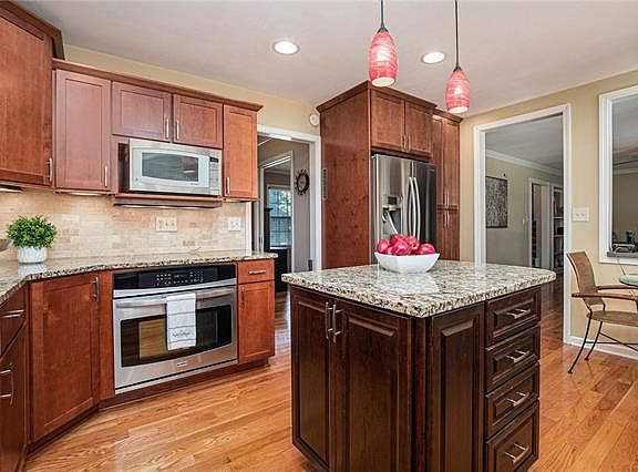 This immaculate, well-maintained 3 Bed + 2 Full Bath, split level home in sought after Bel Air Heights has plenty of curb appeal. Step in the ample foyer and to your right you’ll find that natural light pours into the family room facing the street. Through the beautiful pocket doors, you’ll enter the walk-in butler’s pantry/laundry room (with additional water closet) complete with sink, plenty of counter + cupboard space, and drying/folding area. Keep on going and you’ll find the renovated kitchen, with windows that face the private back yard. The spacious kitchen boasts eat-in dining, granite countertops, SS appliances and a Wolf gas range with 5 burners. The back yard is accessed from the spacious Living room with fireplace, built-in bookcase, and beautiful hardwood floors, which is attached to the kitchen + dining area. The back is a gardener’s paradise, with stone crafted raised beds full of well-maintained delights, fruit trees and lavish sights. The yard is terraced, creating privacy and a serene setting to be enjoyed from the stamped concrete patio. There just aren’t words. The Owner’s Suite, with fresh paint, has an ensuite bath and two closet spaces. Bonuses: Shawnee Mission school district, 2-Stall Garage has extended workshop area with additional utility room, 2 storage sheds in the back yard, new drive way and Gutter Helmet on all gutters.