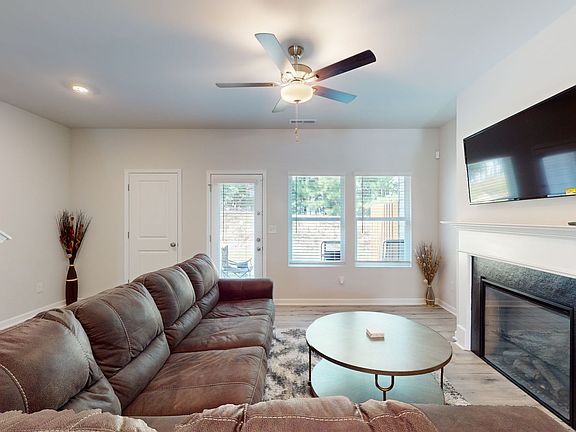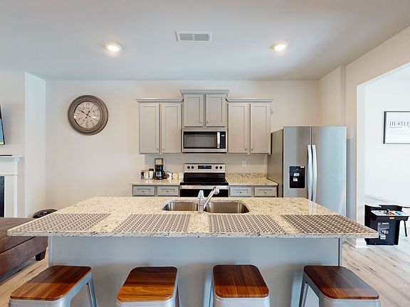 The chef-inspired kitchen includes granite countertops, modern gray cabinetry, and a spacious island with an under-mount sink, providing both function and style. The adjoining family room offers a cozy fireplace an inviting spot to unwind after a long day.