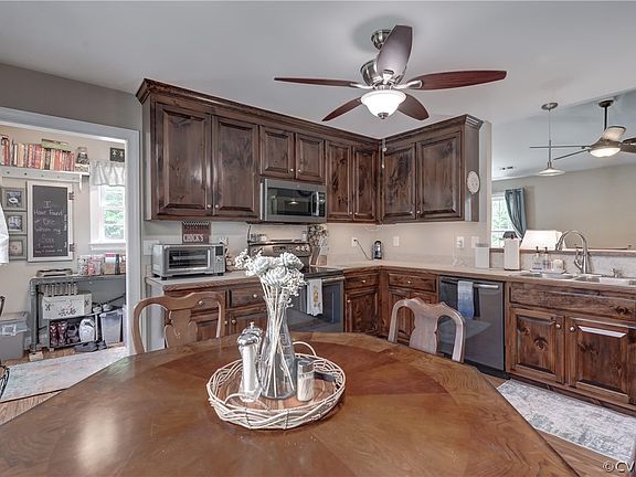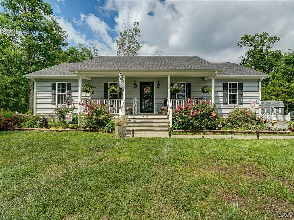 Nestled on a private 5.12-acre lot, this home offers a perfect blend of comfort and functionality. The large covered front porch invites you to relax and enjoy serene views from a rocking chair. Inside, the spacious living room with tall ceilings creates an open and airy atmosphere. The kitchen, featuring an eat-in dining area, abundant cabinetry, and stainless steel appliances, is ideal for both everyday meals and entertaining. The well-sized primary suite includes a walk-in closet and a bath with dual vanity and walk-in shower, providing a retreat-like space. The large rear deck is perfect for grilling and outdoor gatherings, overlooking the fenced backyard and above-ground pool, making it an ideal spot for summer fun. This home combines modern amenities with ample outdoor space, offering a versatile and welcoming environment for any lifestyle.