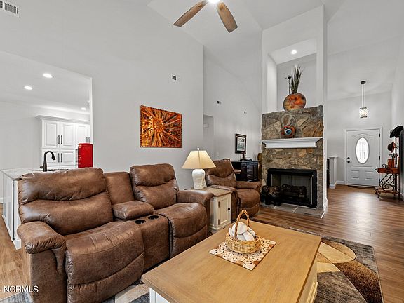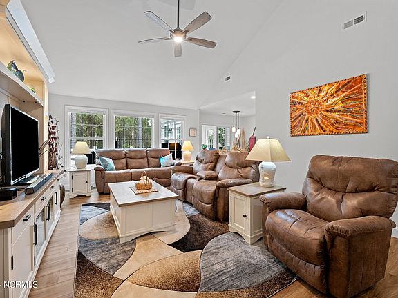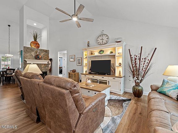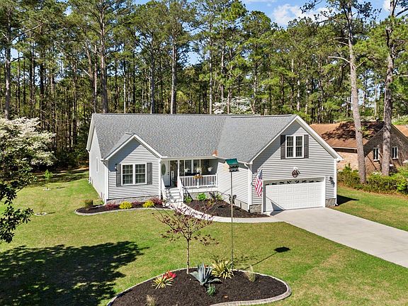 This beautifully crafted custom home was completed less than 2 years ago making it better than new! Relax in the spacious living area warmed on chilly nights by the gas log fireplace or venture out to the bright Carolina Room full of windows bringing the outside in. On sunny days, lounge on you private rear deck complete with a retractable awning. Enjoy cooking? This kitchen comes complete with a gas stove, gorgeous granite counters atop attractive white cabinetry. Entertain dinner guests in the formal dining area or cozy breakfast area. The master bedroom is warmed by plush carpeting, and has a double tray ceiling complete with crown molding. The master bath has a fabulous tiled shower and double sinks. Two nicely sized guest rooms flank a guest bath and the huge bonus room has it's own half bath. The high and dry lot does not require flood insurance. Additional features include Rinnai tankless propane water heater, custom blinds and light fixtures, LVP flooring, a propane hookup on deck for your grill and a high tech garage floor coating. This wonderful home is located in a gated, waterfront community with marinas, an 18 hole golf course, acres of walking trails, boat ramp, fishing pier, kayak launches, parks, pickle ball, tennis, swimming, community center, restaurant, and lots of clubs and activities.