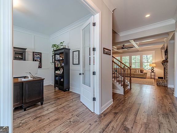You will love this stunning Hillgrove Homes resale in the sought-after Traditions of Braselton community. This home is beautiful from the front door to the back yard. The 8-foot entry doors that are mirrored in the formal living/dining room create such a statement. 10-foot ceilings on the main level, and 9-foot ceilings upstairs. That front flex room would make a great formal dining room, home office, or music room, and you will love the custom floor-to-ceiling wall trim. The great room, kitchen, and farmhouse-sized breakfast room create the perfect entertaining space. The kitchen has double ovens, microwave, dishwasher, gas cooktop, venthood, large island, tons of white cabinets, and granite countertops. The main living spaces feature durable Revwood Flooring. The primary bedroom on the main is spacious with high trey ceilings, and a custom board and batten wall treatment behind the bed. The primary bath is beautiful, with double vanities with granite tops, beautiful tile floors, and oversized walk-in shower that the builder called a Super Shower. Huge walk-in closet. Mud room is across from the oversized laundry, with ample cabinets and a sink. The walk-in pantry is perfection. Butler's pantry with a beverage fridge, prep sink, cabinets and shelves would make a perfect coffee bar. 3 bedrooms and 2 full baths upstairs, plus an extra-large bonus room that is currently a billiards room. The covered back porch with gas fireplace is the perfect place for fall Saturdays watching football. The yard is wooded, with plenty of privacy, and the sellers just invested a good amount of money landscaping the yard with new plantings. This large home is a perfect place to move to in this sought-after golf community. Swim/Tennis/Pickleball and Playgrounds in the community.