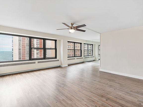 Freshly updated, move-in ready 2 bedroom 2 bathroom CORNER unit with unobstructed lake views is looking for a new owner! The largest floorplan in the building & the BEST priced unit on Sheridan Rd! This unit features a brand new kitchen, new waterproof vinyl flooring throughout, new built out closets, overhead lighting & ceiling fans, brand new bathroom vanity, mirrors, lighting, and it has been freshly painted. This unit gets amazing natural light from the east and north exposure. Huge living room combined with a dining nook, separate kitchen with brand new cabinets and countertops (can be opened up for a fully open floorplan). Plenty of storage within the unit & an additional storage cage located on the first floor comes with this property. Both bedrooms are spacious and the split bedroom layout allow for additional privacy. The location couldn't be more perfect - you are a block away from the Osterman Beach and the Lakefront Trailhead. Whole Foods and Aldi are 5 min away, Thorndale Red Line station that can take you to both Evanston and the downtown Chicago is 7 min away, Metropolis Coffeeshop is a block away, so are the restaurants along Broadway. The building is investor friendly with no rental cap (no short term rentals). Seller is offering $1500 towards a dishwasher (installation allowed) or a new fridge (current one works fine but has a few cosmetic dents). HOA fee as of Jan 1, 2024 is $870.35 (water, heat, electric, common insurance, sewer, lawn care) + $65.39 cable/internet = $936/month includes everything! Rental parking available at 6166 N Sheridan Rd (2 min walk) or waitlist in the building.