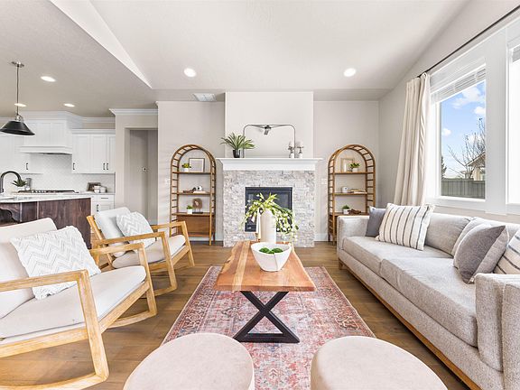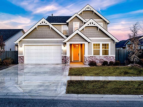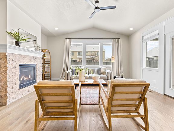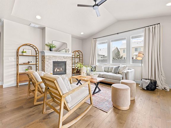 Four spacious bedrooms in this functional & spacious floor plan built by Todd Campbell Custom Homes. Enjoy a flowing great room, kitchen, & dining area. Significant amount of storage throughout the home. The inviting kitchen boasts custom cabinets with soft close drawers, dovetail, & built-ins. Stone countertops, rich hardwood flooring, and gorgeous millwork. Main level master suite features a dual vanity and tile shower. Relish in a spacious tech and office area on the main, with an additional guest bedroom adjacent. An expansive living room is highlighted by vaulted ceilings, with direct access to the sizable covered patio. Three-car garage with a deep tandem on one side. Benefit from a community pool and city park onsite. Quick and direct access to Eagle Road and the freeway for easy commuting around the valley.