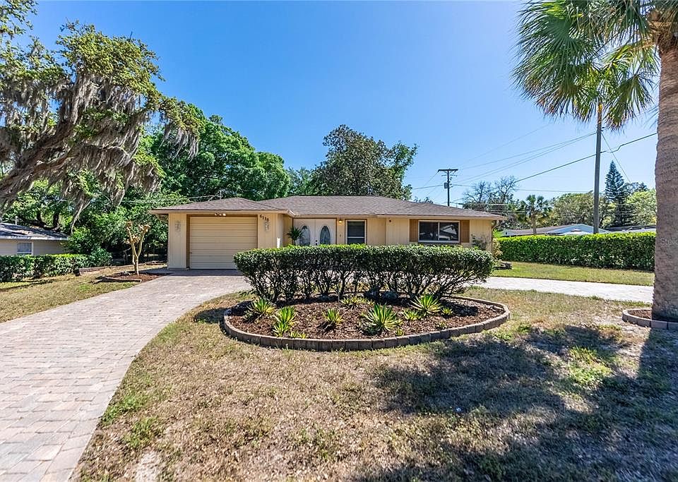 Welcome to this fantastic 2 bedroom 2 bath 1 car garage home close to the heart of New Port Richey. The home is situated on a large corner lot. As you approach you will enjoy the pavered circular driveway as a welcoming feature. The backyard has a 10X12 storage shed. As you enter the front double doors into a large family room dining area combo. To the back and left is the kitchen with a view to the enclosed lanai and back yard. The kitchen has all New stainless steel appliances. Beyond these rooms is a large 17 X10 enclosed lanai that has a window unit to cool and can make a nice flex room or 3rd bedroom. Location is central to New Port Richey and mere minutes to the downtown with tons of restaurants, quaint stores and services. This is a must see!