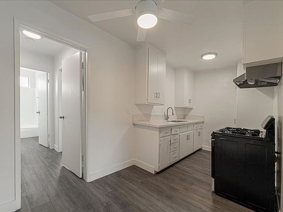 Warm open layoutNew floorsCeiling fanSpacious floor planRefurbished cabinetryAlley-style kitchen