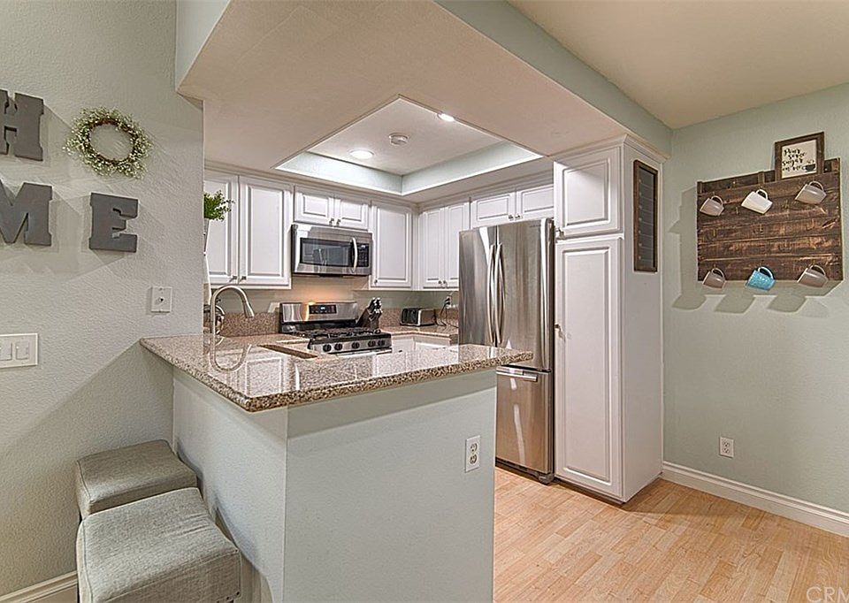 Fantastic updated condo located in the sought after community of The Villages in Yorba Linda. The open floor concept with vaulted ceilings offers plenty of natural light in this spacious 2 bedroom, 2 bathroom home. This lovely home has many upgrades including laminate flooring, remodeled kitchen with custom cabinetry and granite counter tops, stainless steel appliances, coffered ceiling, updated bathrooms, recessed lighting, ceiling fans and custom built-in seating nook in dining room. The master bedroom has ample space for a king size bed and has a walk-in closet. The family room features a fireplace and a sliding door to the large patio area with laundry closet. The wonderful community offers lush green belts, community pool with spa, playground, and picnic area. Water and trash is included in the HOA fees along with electricity for the 2 car garage. Close to walking and bike trails, Savi Ranch Shopping Center, easy freeway access, and sits in the Placentia Yorba Linda Unified School District and zoned for Yorba Linda High School.