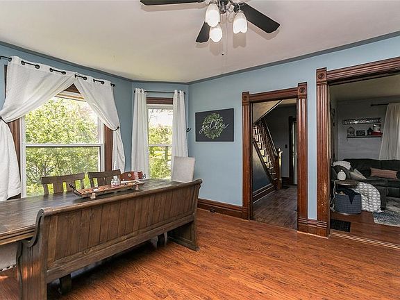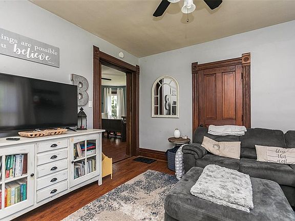 Hardwoods, pocket doors, wide woodwork, and 2nd floor laundry This home has a special entry with great carved staircase, huge dining room open to the kitchen with island stove and walk in pantry. Nice sized living room. There is a bedroom with a full bath on the main, could be a great guest room or office Three bedrooms upstairs, Master has the laundry in it Basement is large and dry. Interesting motorized door lift off kitchen. Great storage The home has ample yard and two stall garage. Down the street from Davis Park, City Pool, and baseball fields. Easy walk to the uptown events, shopping, and restaurants. All appliances stay. Roof is 1 year old.