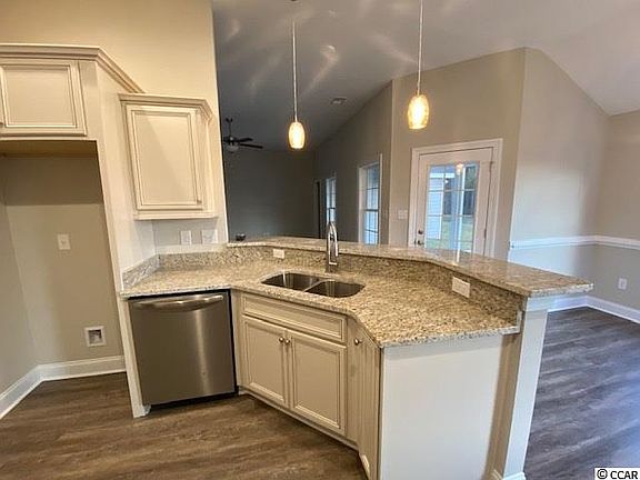 This is our Tupelo floor plan with a screened in porch and sprinkler system! Our standard package includes granite counter top in the kitchen, brushed nickel light fixtures, ultra ceramic vinyl tile in the kitchen - baths - laundry, laminate flooring in foyer and living room, carpet in the bedrooms, flood lights around the house. The Tupelo plan has 10 ft ceilings in family room with optional fire place (upgrade feature) and covered 16x8 porch with 8' ceiling off the back. Whirlpool stainless steel appliances in the kitchen, 5 1/4 MDF speed base throughout the house, molded interior doors and windows with 3-1/4 FJ casing, fiberglass screens on the windows, oval glass steel front door, all bedrooms wired for fans and phone, framed mirrors in the baths, finished garage with trim, paint and carriage door hardware, finished landscape and much more. A must see! We have several options for cabinets, flooring, paint, etc.: Our community is located only 8 minutes from grocery stores and 10 minutes from Downtown Conway. We are also located outside city limits, so you won't have to pay city taxes! Pictures are from our model house located at 400 Oakham Dr., Conway SC 29527. Stop by to check it out! Open house from Tuesday through Saturday from 10am-5pm. Price includes a covered porch instead of carolina room. Pictures represent the model house and colors may differ from actual house.