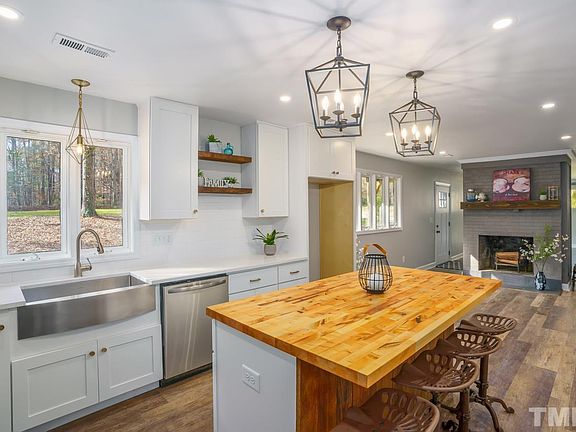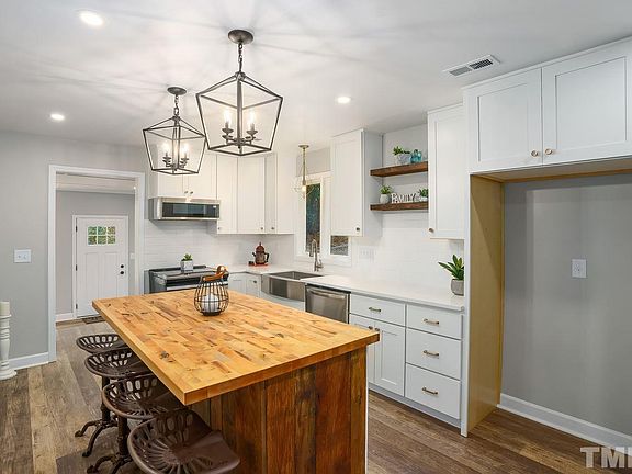 Modern Farmhouse-Style Ranch, FRESHLY RENOVATED. Unique opportunity to own a trendy HGTV-esque showpiece. See the waters of Lake Benson glisten from your driveway. Lives like a 4-bedroom or home office. Work from home in style! Open floorplan. Brand new Kitchen w/quartz & Master Bath w/tile shower. Reclaimed wood accents everywhere. Butcher block island, Stainless steel appliances, Farmhouse sink. Barn doors. New electric/lighting. Spray foam. Too much new to list! Walkable to Lake Benson Park and YMCA.