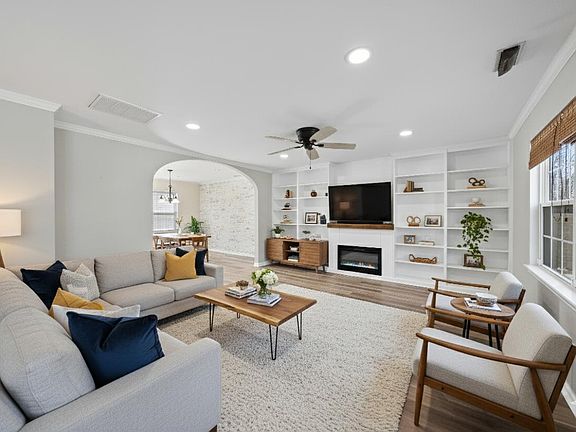 Don't miss out on this 4-bedroom, 2.5-bath home on a .28-acre lot with no HOA. The main level has luxury vinyl plank flooring, while the upstairs features durable laminate. The living room includes built-in shelves from floor to ceiling and an electric fireplace. In the kitchen, you'll find quartz countertops, open shelving, and a corner pantry for extra storage. The primary suite upstairs has a walk-in closet and a private bathroom with beautiful tile, a custom vanity, and a spacious walk-in shower. The backyard is set up for entertaining with a patio, fire pit, cabana, and a 16x12 storage building. You're just minutes from shopping and dining in downtown Clayton. Our preferred lender is also offering up to $2,500 buyer incentive!