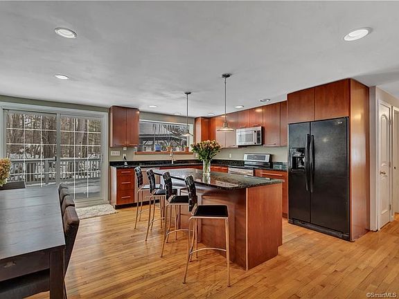 Space and convenience in this expanded Ranch. Step into the main level, where youll be greeted by open living spaces, an abundance of light, and hardwood floors. The kitchen with large center island is open to the dining area, living room, and has sliders to the back deck, making this social hub of the home ideal for entertaining. With a separate entrance and eight available parking spots, this space is zoned commercial, and can be used as a home business or easily transformed into an in-law suite. Three bedrooms and two full bathrooms on the first floor allow for one-level living. Upstairs, a bonus room with cathedral ceilings, skylights, and exposed beams can be utilized as a master bedroom, game room, or studio. In warmer months, enjoy the scenic property from the spacious deck with covered gazebo. Located close to trails, beaches, and restaurants and shops of the shoreline. Schedule your showing today!