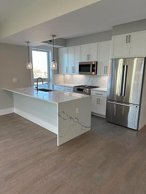 Luxury New Construction Building offering condo quality finishes. This corner 1 bedroom 1 bathroom unit, features incredible natural sunlight and direct views of Boston Skyline. Open kitchen, living and dining room is a perfect space for entertaining. The kitchen has high end Bosch appliances, marble countertops and bar concept seating complete this chef's kitchen. Bathroom features large marble vanity, marble floors and large stone shower with multiple shower heads and a large linen closet. The bedroom has an over sized walk in closet and can easily fit a queen or king sized bed. Laundry in unit, central ac and hardwood flooring throughout. Don't miss out on this opportunity to be the first to live in this stunning apartment! Pet Friendly! Easy to show! Flexible lease terms and start date.