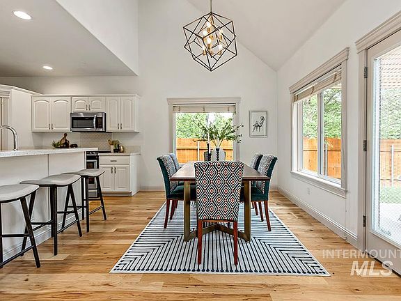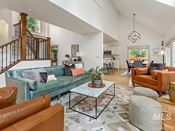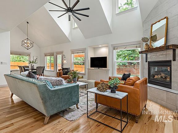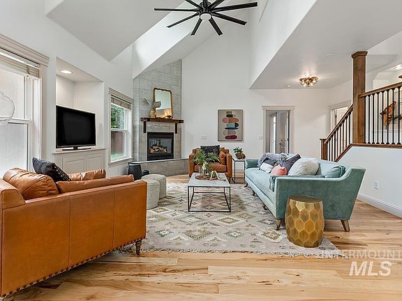 A modern French country home with a big footprint, just minutes from downtown Eagle! Located on a spacious corner lot with no rear neighbors, the home's curb appeal packs a big punch, featuring clean architectural lines, crisp white stucco, & natural stone elements. Double-story cathedral ceilings steal the show upon entry, as a fresh neutral palette & hardwood floors establish the open floorplan, enhanced with curated, modern touches. A cozy gas fireplace with large format tile adds visual weight & warmth to the lofty living quarters. The kitchen recently underwent a makeover, including new countertops, backsplash, & cabinetry hardware that pair well with stainless steel appliances. Aside from the great room, the layout consists of well-planned, intentional spaces to spread out or cozy up. Vaulted ceilings enclose the main-level primary suite, complete with a walk-in shower, soaker tub, &large walk-in closet. Perfect for remote work, the main level also includes an office with beautiful wainscoting detail.