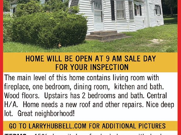 ABSOLUTE AUCTION! This is a Live On-Site Auction! Saturday July 19th at 10:00 a.m. The main level of this home contains living room with fireplace, one bedroom, dining room, kitchen and bath. Wood floors. Upstairs has 2 bedrooms and bath. Central H/A. Home needs a new roof and other repairs. Nice deep lot. Great neighborhood! Terms – 15% deposit day of sale, balance with deed on or before August 19, 2025. TAXES – Prorated. POSS – with deed. 10 day inspection for lead base paint begins July 9, 2025. Home needs make over but can be a great cozy property! Will make a great rental unit. INVESTORS – Spend some money and REAP THE REWARD!! Buy at your price at this ABSOLUTE AUCTION! Make plans to be at the countdown SATURDAY, July 19 – 10 AM!!!! HOME WILL BE OPEN AT 9 AM SALE DAY FOR YOUR INSPECTION