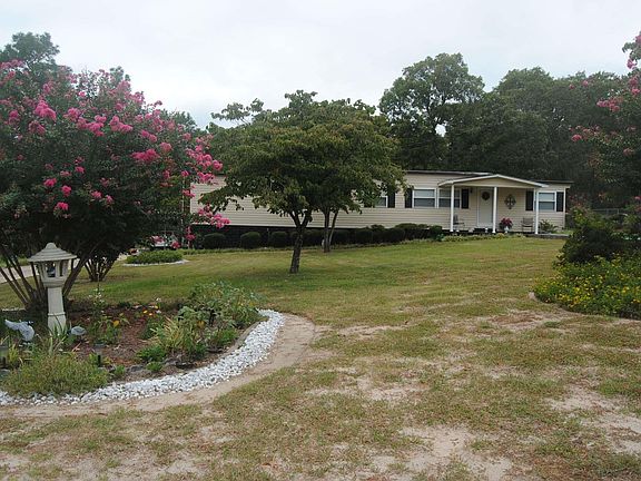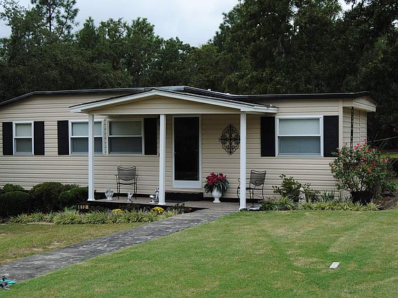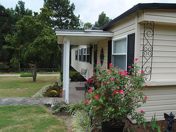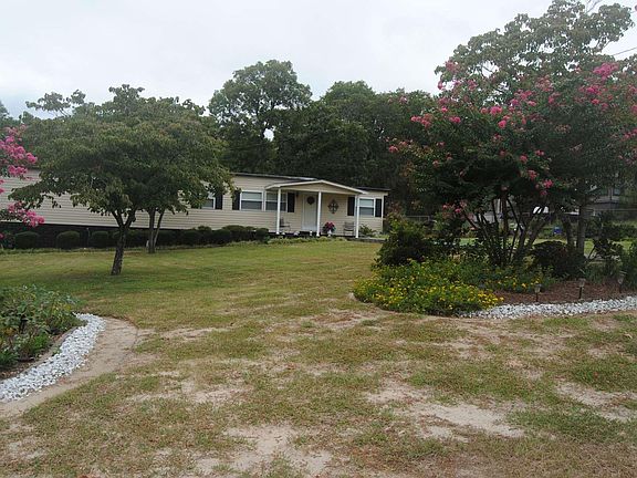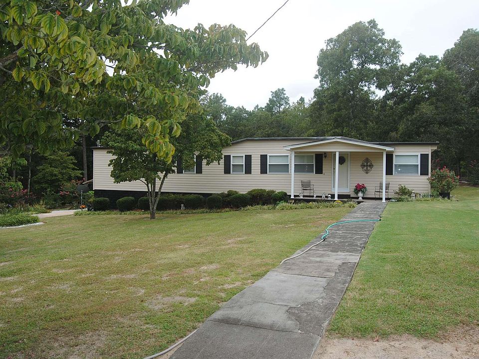 Large lot with mature landscaping with 3 bed/1.5 bath MH, covered front porch, covered back deck, extended paved driveway with detached carport and two storage buildings.