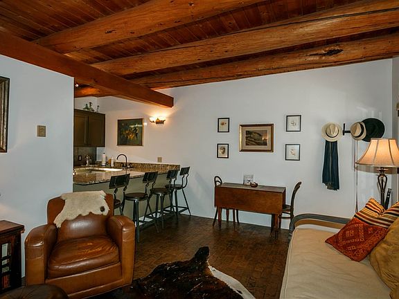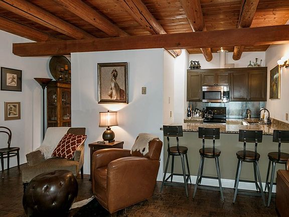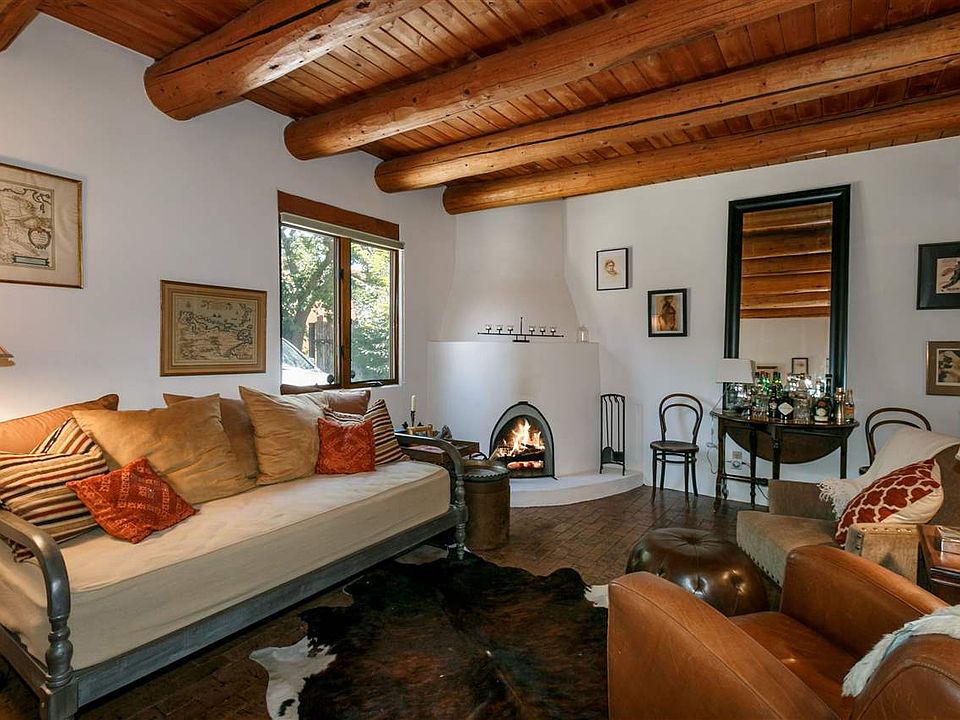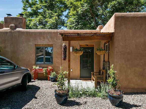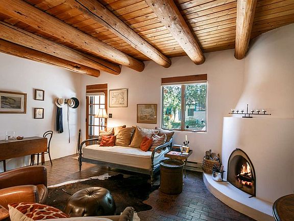 Santa Fe in-town one level unit and recently up-dated! Beautiful rich brick floors, high ceilings with large vigas, and a kiva fireplace, patios, mature trees and a very special private courtyard off the bedroom! Easy lock-and-leave unit in a property of just 5 condos in the heart of South Capital District. Open floor plan, granite counters, designer touched throughout. Off street parking and more.