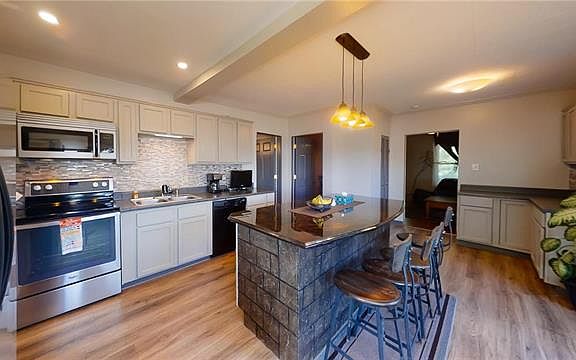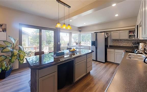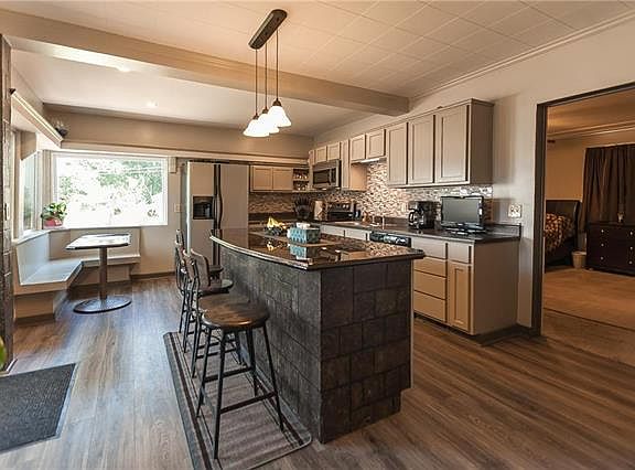 Holy cow, would you take a look at this amazing, gigantic kitchen with island and built-in corner eating nook! Wowza on the master suite with walk-in tiled shower and laundry. The side yard space gives a sense of tranquility with the deck, arbor and landscaping! Wood floors in the living room, office nook and second bedroom. The heating and cooling systems are less than 2 years old! Basement with carpeted, non-conforming 3rd bedroom, other finished room and epoxy floor in the unfinished area. 1 car detached garage