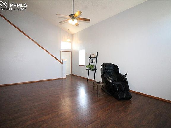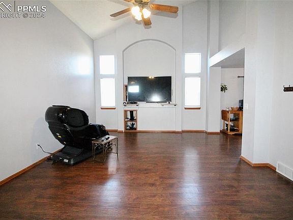 Must see this spacious Fountain beauty with 4 bedrooms, 4 bathrooms and an oversized 2 car garage. Fresh paint and new flooring throughout. The main level living room has fabulous vaulted ceilings, LVP-plank floors and entertainment built-ins. The cozy kitchen has tons of cabinets, counter space and stainless appliances. The island bar area provides additional seating next to the convenient walk-out dining area. The upper level has 2 secondary bedrooms and a large full bath. The bright, beautiful primary suite has vaulted ceilings and an attached bathroom. The attached primary suite bathroom is complete with a double vanity, jetted soaking tub/shower combo and sizable walk-in closet. The finished basement has a large bedroom, full bath, office and living room with a mini wet bar complete with extra refrigeration options. Both front and rear of the home are xeriscape with beautiful, low maintenance turf, decorative fencing and a 22 x 44 basketball court that awaits the sports enthusiast in us all. This home has very convenient access to the local military installations, I-25, schools and shopping. Do not miss out... come take a look!