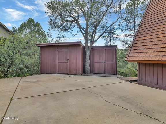Check out this adorable a-frame home in the desirable Yavapai hills community. This beauty welcomes you home with soaring beamed ceilings and tall windows giving the interior a light airy feel. On the entry level, you are drawn into the open great room with a warm gas fireplace, bright dining room, well laid out kitchen and a porch to enjoy the beautiful Prescott weather. There are two spacious bedrooms and a cute guest bathroom off of the main living area for all of your main level needs. Climb the whimsical spiral staircase to the loft which boasts your large master bedroom, bathroom and deck. Downstairs from the main living area you'll find tons of storage space along with your laundry room and a heated/cooled basement which would make an incredible work from home space, additional