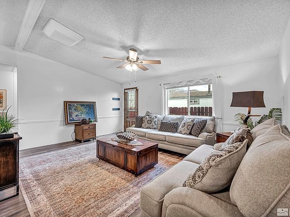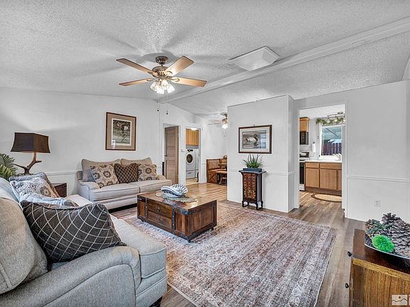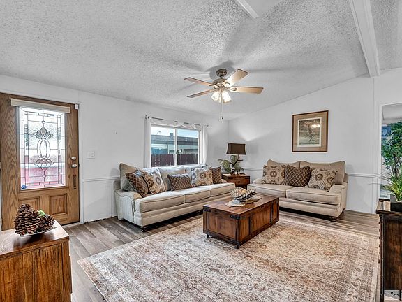 VIEWS! This home features a nice lot with mountain views from the rear deck and backyard. Enjoy morning sunlight from the primary bedroom that opens to the low maintenance fenced back yard that features an uncovered deck and a shed. This home has 3 bedrooms, vaulted ceilings in the living, kitchen, and dining areas, and 2 bathrooms. Feels larger than 960 sq.ft. There is a two-car carport, ramp for easy entry, lots of pavers and concrete for easy maintenance and the refrigerator, washer, dryer are included., The gated driveway welcomes you and the views from the back yard make for a house to call home. The shed, washer, dryer, refrigerator are included as-is, and no value. The home has forced air for heat and an evap. cooler for those warm days. There is an ALARM so please do not enter property with a confirmed appointment with your favorite real estate professional.