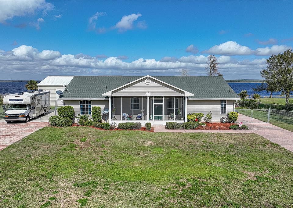 FABULOUS LAKEFRONT RESIDENCE on nearly an Acre of land, a 184’ shoreline on Crooked Lake, huge steel building and so much more to see! The beautiful home offers 1,752 sqft living space with 3 BD/2 BA split plan and open concept; the living area is a wonderful open and bright space with a mega picture window that gives a stunning view of Crooked Lake! The dining area stands adjacent to the lovely kitchen with light cabinetry, coordinating granite countertops, stainless appliances and a peninsula breakfast bar that is practical for the open living and dining areas. The spacious master en suite is graced with a striking tray ceiling and a perfect lakeview as sliding glass doors open to the private, 17x8 screen porch. To complete the master suite is a walk-in closet and its bathroom has a tile walk-in shower and a dual sink vanity. The opposite side of the home houses two bedrooms and a full bathroom with tub. Pride and comfort in ownership of this property is evident, as it has been immaculately maintained, quality materials used, with great design and function of the interior and exterior. The home boast 3 screen porches with ceiling fans, large open patio, dual driveways, huge parking pad for boat, motorhome and vehicles. The large metal structure gives all the storage space necessary and easy access for high profile vehicles. This fabulous home and property sits directly on Central Florida's premier body of water, Crooked Lake; it’s a sure bet that the next lucky owner will love their FLORIDA PARADISE! Room Feature: Linen Closet In Bath (Primary Bedroom).