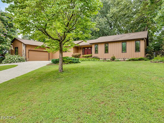 This single story peaceful retreat along a quiet dead end street features a two car attached garage, eye-catching double door entry, circular driveway and plenty of parking, an open floor plan, wood blinds throughout, plenty of windows and natural light, hardwood floors, granite countertops, and loads of room to entertain. Large central kitchen has brand new granite countertops, solid hardwood cabinetry with pull out shelves and lazy susans, a center island, built-in wall oven, ample outlets, and a small side room/ breakfast nook that leads to the enclosed patio which could easily be converted to a butler's pantry for additional storage. The spacious sunken living room features built-in oak bookshelves, four long windows that let in plenty of natural light, and a large stone fireplace with solid wood mantle and brand new oil rubbed bronze insert. Master bedroom, en-suite spa bathroom, and large master closet have vaulted ceilings. Master bedroom has 3 floor-to-ceiling windows and French door leading out to the outdoor concrete patio. Two skylights provide plenty of natural light to the spacious master en suite spa bathroom which has been updated to include granite counter tops, corner glass shower, private toilet room, 10 jet corner tub, and has been wired for TV mount. Huge master closet off en suite has tile and loads of shelving and storage space. French doors lead from both the living room and side dining room/ butler pantry/ breakfast nook to 20 x15 enclosed, tiled screened in porch and 25x25 concrete patio. Backyard is fully fenced and loads of hardwood trees for shade and privacy. House has been freshly painted inside and out, and two HVACs units have been replaced. All bedrooms have hardwood floor. Two car garage has overhead storage and pegboard wall. House has motion sensor flood lights. Ceiling fans promote air circulation in most rooms, including enclosed patio. Many lights have dimmer switches. Both bathrooms have double sink vanities. Neighborhood also has two golf courses within 3 miles. Convenient location is less than 3 miles from the interstate as well as shopping and entertainment. Come sit by the stone fireplace, watch the birds fly and the wisteria grow in this cozy suburban retreat in the heart of tranquil, Farragut, Tennessee.