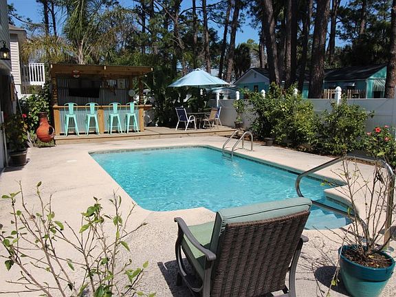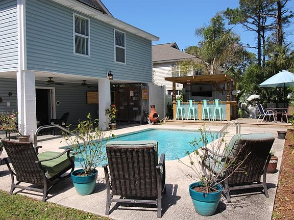 Beautiful Pool home in a terrific, quiet and low traffic island location with beautiful sunset views from the upstairs terrace. Comes fully furnished and has an excellent rental history or perfect for you and your family. New roof is being added soon. 5 bedrooms, 2 1/2 bath, private outdoor shower, tiki bar with tv, multiple living areas. Waterproof PVC flooring upstairs and tile downstairs. Just a truly wonderful home. Kitchen, master bath and flooring all recently remodeled. Buyer's agents welcome. Showings by appointment only as home is an active vacation rental.