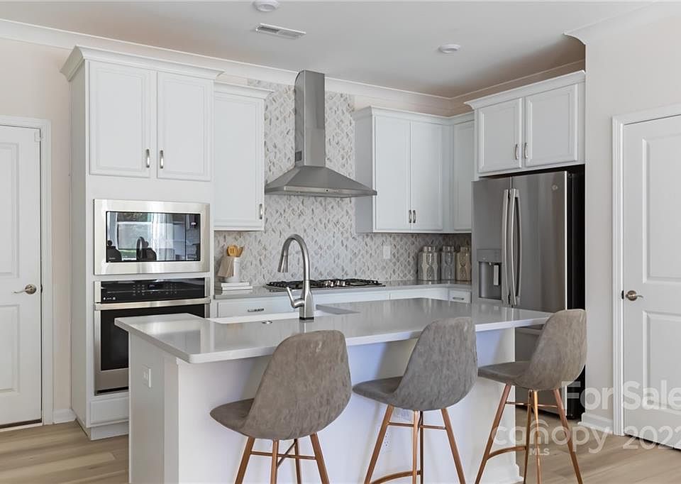 Stylish New Home for Sale featuring a Gourmet Kitchen w/ Gas Cooktop, Upgraded Primary Shower, and an Additional Vanity in the Secondary Bathroom. We invite you to discover homesite 44 at SouthEnd at Tryon in the South End Community of Charlotte, NC. The kitchen features the gourmet kitchen upgrade, presenting a 36" gas cooktop, elevated stainless steel appliances, white cabinets with a contrasting stone gray island, white backsplash tile, all tied together by the stunning Miami Vena quartz counter tops. The great room and dining room seamlessly flow together to create a spacious first floor complimented by the lovely front courtyard. Upstairs, there are three bedrooms, including the primary suite, featuring an expansive shower with all tile walls and tile pan. The secondary bathroom has an additional vanity.