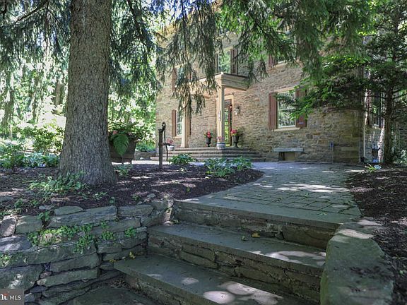 54+ splendid acres of Bucks County countryside accommodates this historic homestead. With over 3,300 sq.ft. the vintage c. 1794 farmhouse offers 2' exterior stone walls, 4 fireplaces and wide plank floors throughout. A long driveway leads to this home, nestled amidst a storybook setting with 2 ponds and trails for horseback riding, cross-country skiing, or nature walks. The generously proportioned rooms begin with a front 1850 Music Room addition, accessible from the entrance foyer. Across the hall, the 1850 eat-in kitchen addition with wood stove steps down into the Dining Room with walk-in fireplace. Open to the 1986 Family Room addition with vaulted ceiling, skylights and picture window with views of one of the property's tranquil ponds stocked with fish. Access to the screened-in Porch may be gained either through the Family Room or the summer kitchen, which now serves as an Office. A powder room is tucked next to the stairs leading to the second level, where three of the five bedrooms are located, the 2 secondary on the 2nd floor are (1850 additions). The ceiling from the Master Bedroom Suite was removed to expose the beams, and re-purposed to seamlessly continue the flooring in the dining room on the main level. Skylights brighten the family room and highlight another stone fireplace. In addition to the Master Bathroom with steam shower and sauna, another full bathroom with jetted tub and laundry room complete this level. Two more (1850) bedrooms and a large walk-in closet/storage area are found on the third floor. A finished lower level provides an Exercise Room and plenty of storage areas. Extensive hardscaping provide different choices for outdoor entertaining and relaxing. A two-story barn, charming stone ruins, and the surrounding grounds comprised of both wooded and open pasture make this a once-in-a-lifetime opportunity. Minutes from historical Doylestown Borough where you can enjoy great culture, entertainment and restaurants. Enjoy award-winning Central Bucks School District. Low taxes, Act 319 Forestry Reserve.