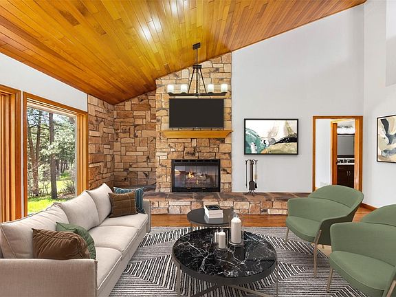 Inside, you’ll find a warm and inviting atmosphere with newly stained hardwood floors and fresh interior paint throughout. The vaulted living room features a dramatic stone-surround, wood-burning fireplace and a stylish wet bar—ideal for entertaining or cozy evenings in. The kitchen blends functionality and design with granite countertops, a central island with seating, a pantry, and a reverse osmosis water filtration system.