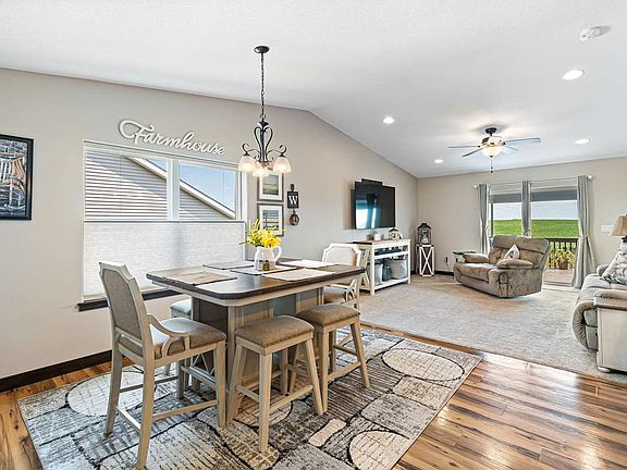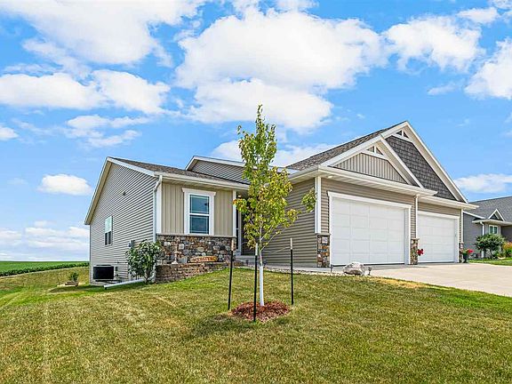 This stylish 4-bedroom, 3-bathroom home is a must-see. The main floor offers an open floor plan with a spacious kitchen and walk-in pantry. The primary suite boasts a dual vanity along with a large walk-in closet that connects to the laundry area. Additionally, there is another bedroom and bathroom on the main floor. In the lower level, there is a large soundproof recreation room, two well-sized bedrooms, and a full bathroom. The 2-car garage is made more spacious thanks to the addition of hanging storage. The deck off of the living room provides the ideal spot to sit and admire the beautiful Iowa countryside.