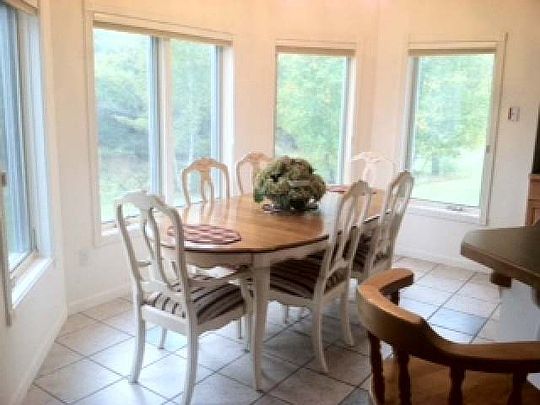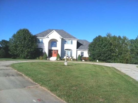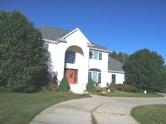 Upscale two story home; brick & vinyl siding, rear deck, impressive front porch entry to foyer. Main level has open great room, custom kitchen, stainless steel appliances, sep laundry room to 3+ car garage. Master and addn'l bedroom or den. 2.5 Baths.Sep laundry. Cathedral ceilings, Spectacular spiral staircase to upper level; featuring 3 large bedrooms, 2 more bath suites, large hallway with views over great room. Mostly hardwood & ceramic floorings. 4 of 5 bedrooms carpeted. Carpeted spiral stairway to unfinished HUGE basement with WO sliders to rear yard. Some furnishings possibly avail.