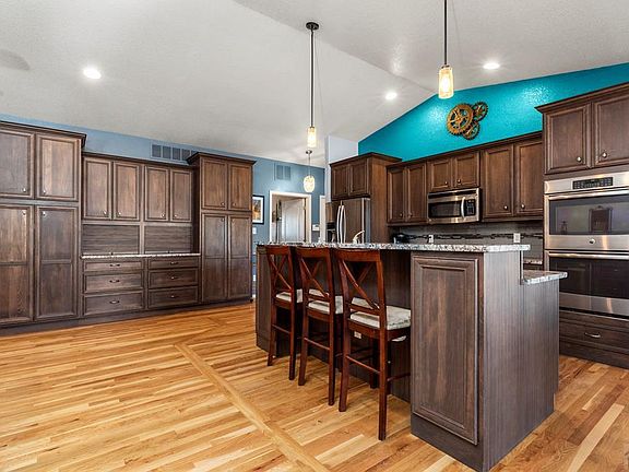 Beautiful sprawling rancher with a finished basement, 5 bedrooms, 3 baths, 3 car garage and a Pole Barn being used as a mechanic's shop. Home has a lot of architectural design and personality. New owner will love the kitchen with 2 huge islands with lots of counter space. Large pantry, numerous custom cabinets. Built in desk and cabinets Stainless steel appliances, gas grill, double oven, built in microwave hardwood floors. 2 sided fireplace, Living room opens up to the kitchen and large formal dining room. Split bedroom design. Good size master bedroom that walks out to the enclosed patio area or work out room. Beautiful master bathroom with a claw tub, walk in closet and vanity. Main level laundry, main level office with built in cabinets. Full finished basement with a theater room with elevated seating and wet bar. There are 2 bedrooms in the basement one of which is huge with its own sink. Granite in all the bathrooms, This home was built with 2x6 construction, covered back patio, gorgeous views, fenced in back yard.