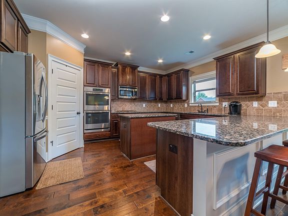 • Kitchen: Bar, Counter Tops-Granite, Eat In, Pantry, Island, Floors-Hardwood, Cabinets-Stained, Backsplash-Tiled, Recessed Lights