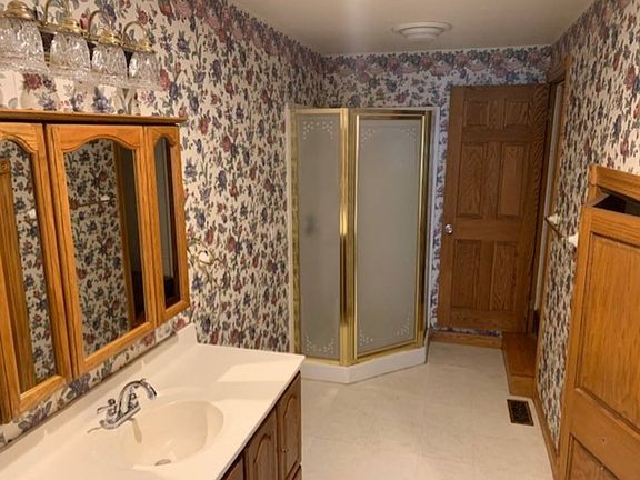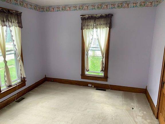 Open front porch. Living Room: Nice large size. Light beige carpet, painted walls. Kitchen: Has white cabinets, white countertops. Eat in size. Range, refrigerator, and dishwasher are inlcuded. White and yellow painted walls. Bath: Has been redone in the last 7 years. All tile nicely done, large vanity, tub/shower combo, vinyl flooring. Laundry: Handy off the living room. Washer and dryer also stay. Master Bedroom: Painted walls, neutral tones carpet, large closet, nice size room. Bedroom: French door, same carpet as living room, also a nice size room. Full basement, 1 1/2 stall garage, extra lot, fenced in back yard, maintenance free exterior, new windows.