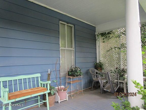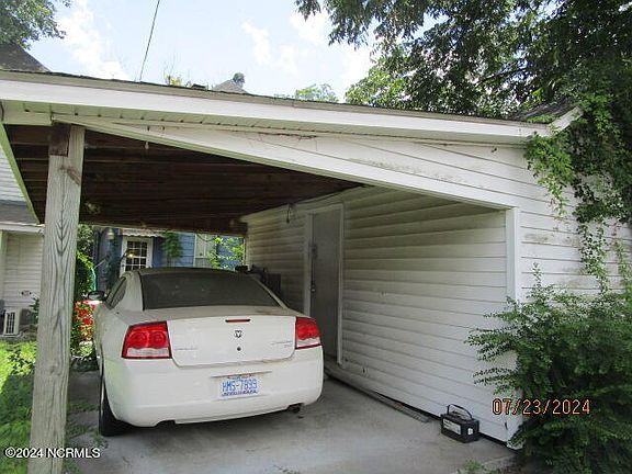 This two-story home, nestled in the heart of Elizabeth City, features three bedrooms, 1.5 bathrooms, a living room, den, and an eat-in kitchen. It includes a carport with an attached office and a welcoming front porch. The home is warmed by two sets of gas logs and cooled with window units. A stairlift provides access to the second floor, and the full bathroom boasts a clawfoot tub. Built-in bookcases and a rear alley entrance add to its charm. Notably, the first floor's den area exhibits a sagging floor that has not been inspected. Title transfer will be executed via a Guardian deed, subject to Clerk of Court approval. The tax card records the home's age as 1920, though the owner's son believes it was built in 1907.