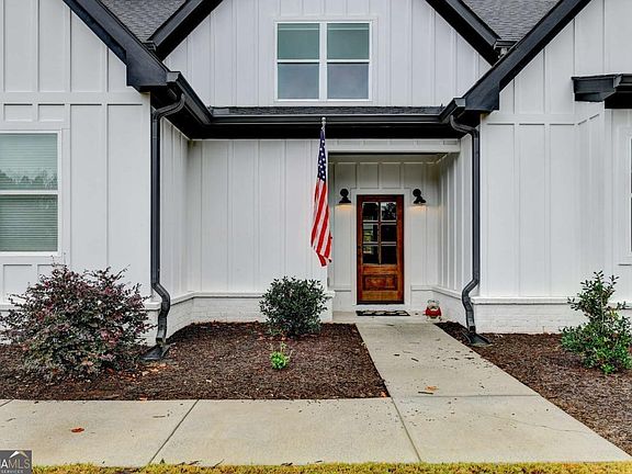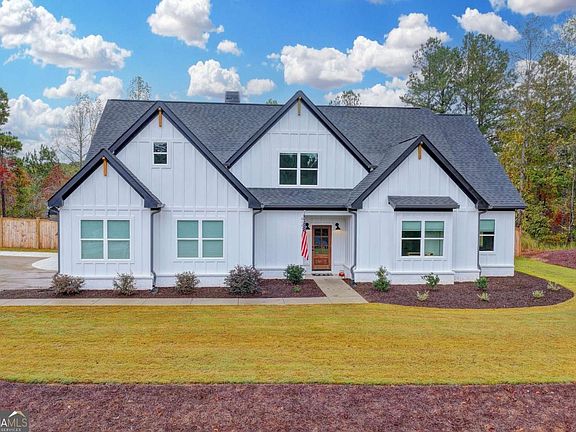 Welcome to this gorgeous stepless RANCH with modern farmhouse flair, perfectly situated on OVER 2 ACRES in a quiet cul-de-sac and zoned for GREAT SCHOOLS. This LIKE NEW and beautifully maintained home offers comfort, style, and functionality in one of the largest lots in the neighborhood. The exterior boasts board-and-batten details, a two-car side-facing garage with an extended parking pad, landscaped and manicured front lawn, and a covered front entry that creates standout curb appeal. Step inside to a welcoming foyer with judges paneling that wraps the entryway and leads to a convenient mudroom with a built-in drop zone from the garage. The vaulted great room impresses with exposed beams, a sleek floor-to-ceiling brick fireplace, and an open concept dining area that flows seamlessly into the eat-in kitchen. The kitchen is complete with a large island and breakfast bar, wall oven, beverage cooler, stainless steel appliances, subway tile backsplash, and pantry. Desirable setup for entertaining or everyday living. PRIMARY SUITE ON THE MAIN LEVEL is also vaulted for an airy, grand feel and includes a cozy sitting nook, perfect for reading or working from home. Beautifully stained barn door leads into the luxurious en-suite bathroom, featuring marble-inspired tile, a frame-less glass shower, dual vanity, freestanding soaking tub, and a spacious walk-in closet. Two additional secondary bedrooms and another full bath plus a half bath are located on the main level, while a large BONUS ROOM above the garage offers a full bathroom, making it ideal for guests, a teen suite, or multi-generational living. Enjoy outdoor living year-round on the covered patio featuring a SECOND FIREPLACE and a mounted TV with weatherproof cover (included). The huge fenced backyard provides endless possibilities along with wooded views that offer privacy and space to add a pool or design your dream outdoor escape. Community resort-style amenities include an Olympic-sized pool with slide, clubhouse, playground, pickleball and tennis courts. Conveniently located near healthcare, shopping, dining, and downtown Canton's local favorites. This home combines quiet living with unbeatable accessibility. Modern farmhouse living at its finest! A thoughtfully designed home on a private lot with all the charm, comfort, and space you've been searching for.