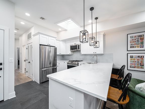 AVAIL DEC 1. Live in this gleaming 3 bed, 2 bath apartment at 612 Washington St, Hoboken. Unit 3 is located on the third floor, two short flights of stairs up (no elevator). This gut renovated apartment sparkles with modern finishes: LED recessed lights, central AC, engineered wood floors with sound proofing, high ceilings, sleek doors and woodwork, custom closets, window blinds, ceiling fans, tiled bathrooms with hanging vanities, on demand hot water, wiring for cable/internet, and full size in unit vented laundry. The gleaming kitchen has marble look quartz, glass backsplash, stainless appliances and plenty of storage. The largest bedroom includes an en-suite bathroom and walk in closet with three walls of cabinetry. The 2 other bedrooms fit a queen and full size bed comfortably, offer plenty of custom closet space, and share a spacious hall bathroom with a generous shower. Two skylights are an added bonus. A virtual "Doorbird" doorman/video intercom allows for remote unlock via dial to phone (no more lost packages)! Jan 1 occupancy. 12 month minimum lease, no corporate leases, no short term leases. Persons named on the lease must occupy the home Max 3 room mates. Dimensions -- Bedroom 1: 15' x 10'7", bedroom 2: 11'2" x 9' 7", bedroom 3: 10' 4" x 7'; all bedrooms have closets, windows and door. 1.5 month security deposit, 700+ credit scores please. 612 Washington is located in the heart of Washington St., in a rare no-flood zone in Hoboken, a short walk to the PATH, bus stops, and the area's best restaurants and shopping.