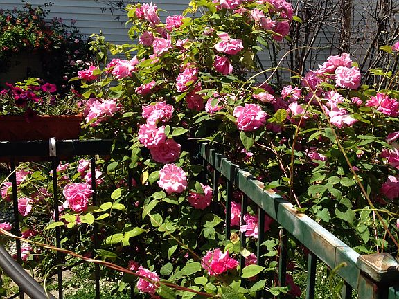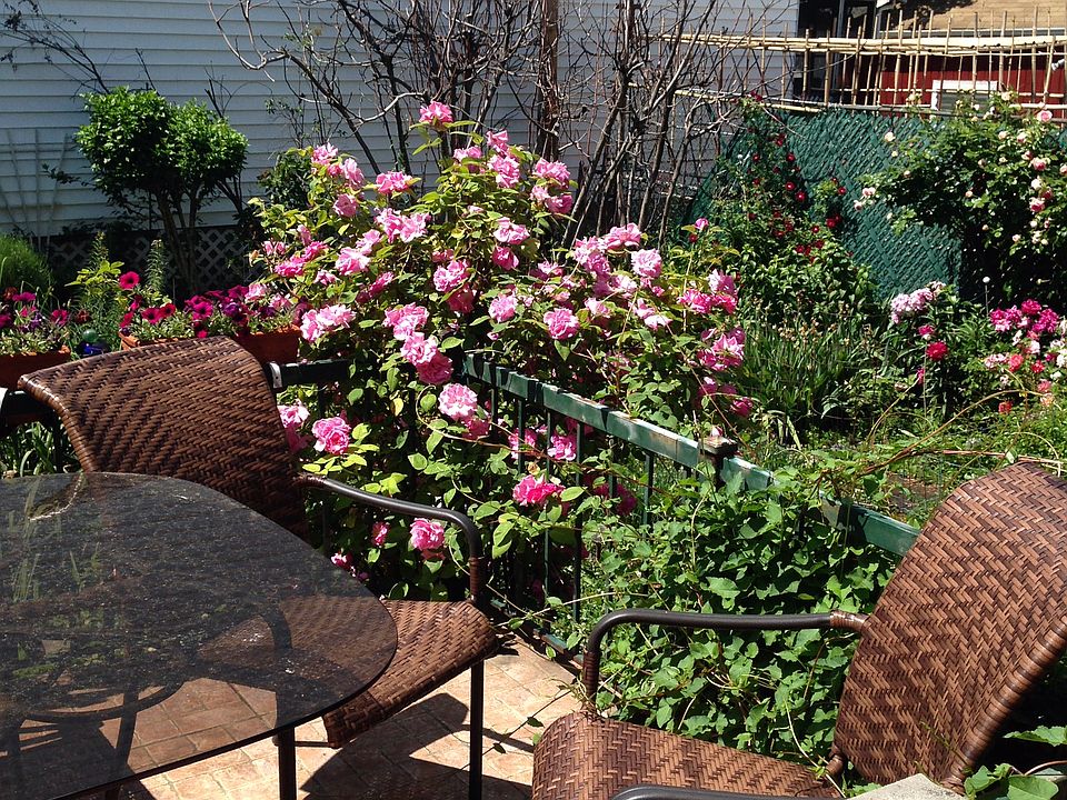 Huge private backyard, fully planted with many roses and other flowers- a beautifully large fig tree.