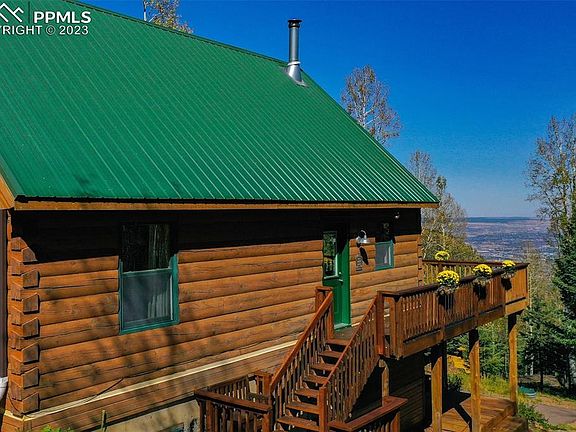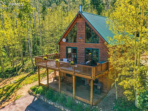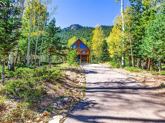 SPECTACULAR! is the only way to describe this very special property on a private cul-de-sac up at the top of the exclusive gated community of Crystal Park. Passing the manned guard house, you will experience unbelievable scenery and views on Crystal Park Rd, deemed "the world's most wonderful scenic mountain auto trip" by a 1910 travel brochure. Pulling into your paved driveway, you will pass your picnic table tucked into the aspens by a live stream and multiple trailheads through the adjoining HOA open space leading to Pike National Forest, Cameron Cone and the east flank of Pikes Peak. Exiting your car, you will catch your breath as you take in the wondrous sights, sounds and scents of true mountain living among the soaring conifers, shimmering aspen groves, towering rock formations and panoramic views. Oh, and there's a darling chalet-style log and cedar-sided lodge waiting to welcome you home with the perfect balance of traditional alpine cabin features and all the amenities and upgrades you'd expect in a modern home. The entire lower level has been masterfully converted into a spacious master suite that walks out to a 250+ sq ft, east-facing deck, perfect for viewing sunrises with your morning coffee. In addition to the adjoining full bath are a sitting area, an office, laundry space with sink, several large closets and storage spaces and a pellet stove. The newly remodeled main-level kitchen features additional cabinet and counter space, block counters and gunmetal stainless appliances. The dining area completes this spacious great room, and both walk out past the cozy wood stove through large sliders to the upper deck overlooking the gorgeous valley and the city below, perfect for indoor/outdoor entertaining. 2 more bedrooms and a full bath complete the main level. Perched above all this is the private living room with gorgeous red oak flooring, tongue and groove ceilings and views to the east and west. Truly must see to believe, don't let this one slip by.